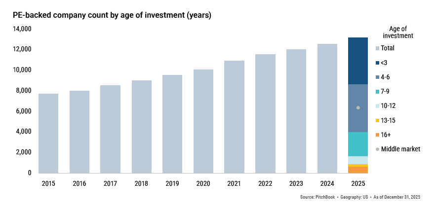 More than 6,000 PE-backed middle market companies remain unsold, with median hold periods stretching to 6.4 years.