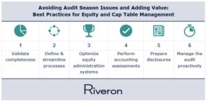 As an independent advisory firm, Riveron is deeply entrenched in audit preparation activities and understands the significant scrutiny placed on equity audits. Our experts provide comprehensive, full-scope equity accounting and administration solutions designed to manage risk, accelerate your timeline, and ensure technical compliance this audit season. We partner with management teams to transform chaotic equity processes into clear value drivers by providing: