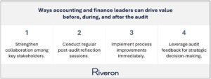 - Strengthen collaboration among key stakeholders. To make the audit process genuinely effective, it’s essential that all stakeholders—accounting and finance teams, auditors, company leadership, and the audit committee—work closely together throughout the year. This ongoing collaboration ensures that feedback is actionable and that areas for improvement are addressed promptly.